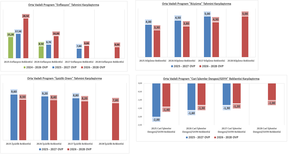 Önceki OVP’de 2025 için %17,5, 2026 için ise %9,7 gibi çok daha düşük hedefler yer alıyordu. Dolayısıyla Ağustos’ta TÜFE’nin %32,95 seviyesinde gerçekleşmesi, yukarı yönlü revizyonların kaçınılmaz olduğunu teyit etmiş oldu. Yeni tahminler piyasa ile daha uyumlu olsa da, 2026 hedefi ile piyasa beklentileri arasındaki makas hala programın uygulanabilirliğine dair soru işaretlerini canlı tutuyor.