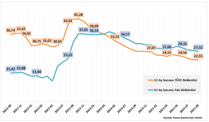 OVP’de enflasyon patikasına yönelik yapılan revizyonlarla birlikte daha gerçekçi bir çerçeve ortaya kondu. 2025 için enflasyon tahmini %28,5’e yükseltilirken, 2026 için %16’lık hedef belirlendi. Ancak mevcut ekonomik görünüm altında bu hedefler oldukça iddialı görünüyor. Piyasa beklentisi 2026’da %20–23 bandında şekillenirken, TCMB’nin Eylül ayı Piyasa Katılımcıları Anketi de benzer bir tablo ortaya koyuyor. 12 ay sonrası için %22,55, 2026 sonu için %20,75 seviyeleri öne çıkıyor.
