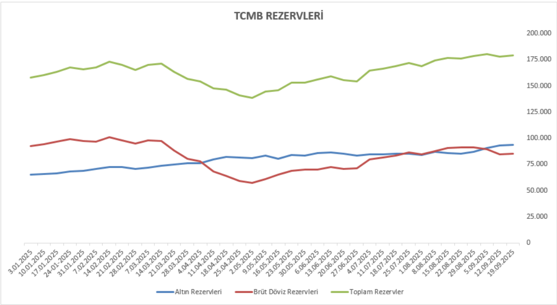 Rezervler tarafına bakıldığında ise Ağustos ayının son haftasından 19 Eylül ile biten haftaya kadarki süreçte altın rezervlerinde 6,42 milyar dolar artış yaşanırken döviz rezervlerinde 5,93 milyar dolarlık azalış dikkat çekmektedir. Toplam rezervler ise bu dönemde 0,5 milyar dolarlık artış kaydetmiştir.