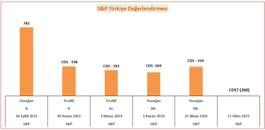 Uluslararası kredi derecelendirme kuruluşu S&P, 1 Kasım 2024’te Türkiye’nin kredi notunu “B+”dan “BB-”ye yükseltmiş, ancak görünümü “pozitif”ten “durağan” seviyesine çekmişti. O gün Türkiye’nin 5 yıllık CDS primi 269 baz puan seviyesindeydi. Aradan geçen altı ayın ardından, 25 Nisan 2025’te yaptığı değerlendirmede S&P, beklentilere paralel olarak kredi notunu “BB-”, görünümünü ise yine “durağan” olarak koruduğunu açıkladı. Ancak bu kez karar günü CDS 334 baz puan seviyesindeydi. Yani Kasım’a kıyasla risk priminde gözle görülür bir artış söz konusuydu.