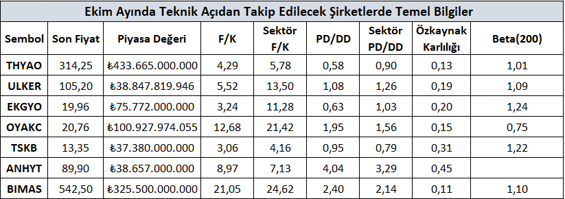 Ekim ayı dinamiklerinde teknik göstergelerle uyumlu çalışabileceğini düşündüğümüz şirketlere yönelik genel düşüncelerimizi raporumuzda ayrıntılı bir şekilde sizlere teknik analiz bölümünde paylaştık. Bu şirketlere yönelik genel bilgilere yukarıdaki tablodan ulaşabilirsiniz.
