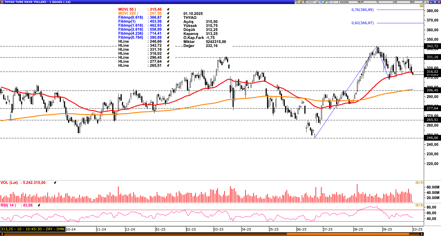 THYAO: Son süreçte 342,72 bölgesinden baskı gören THYAO, 50 günlük ortalama bölgesinde denge bulmaya çalışmaktadır. İlgili ortalamanın destek görevi görmesi halinde ilk etapta 331,16 seviyesi kritik eşik olarak izlenirken aşılması halinde baskı gördüğü 342,72 seviyesi ve 366,87 direncine doğru hareket akışını sürdürebilir. Olası baskılanmalarda 220 günlük ortalama (297,55) güçlü destek olurken altında fiyatlamalar realizasyon sürecini derinleştirebilir. Mevcut görünümde 220 periyotluk ortalama üzerinde kalındığı müddetçe iyimser beklentimiz ön planda yer almaktadır. Özellikle Ekim ayının sonunda başlayacak olan üçüncü çeyrek bilanço sezonunda mevsimsellik faktörünün ektisiyle havacılık sektöründe olumlu sonuçlar izlenebilir ve bu durumunda fiyatlama üzerine yansıması olasılık dahilinde yer almaktadır.