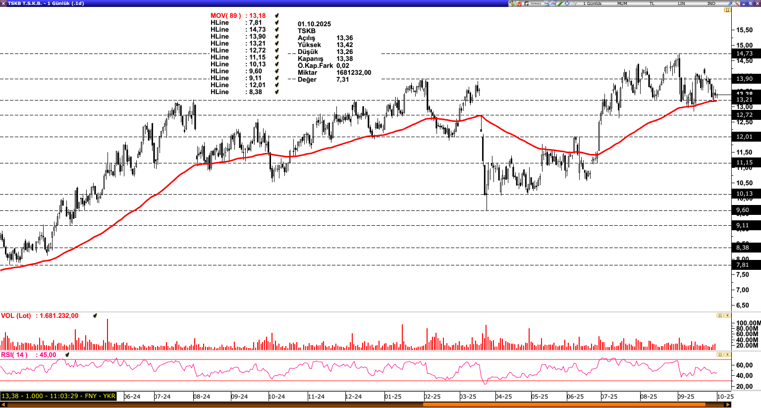 TSKB: 89 periyotluk ortalamadan aldığı destekle dikkatleri üzerine çeken TSKB iyimser beklentileri gündeme taşımaktadır. Hem bilanço sezonunun yaklaşması hem TCMB’nin faiz politikasına yönelik atığı gevşeme adımları bankacılık sektörüne Ekim ayında yeni bir ivme kazandırabilir. Böyle bir senaryoda TSKB uygun çarpanlara sahip olmasıyla da beraber bir adım öne çıkabilir. Teknik görünümde yukarı yönlü hareketin devamıyla 13,90 seviyesine doğru hareket akışı izlenebilir. 13,90 seviyesinin aşılması ise 14,73 seviyesine doğru yeni bir hareket alanı oluşturabilir. Olası geri çekilmelerde 89 periyotluk ortalama güçlü destek bölgesi olarak takip edilirken altında kalıcı fiyat hareketleri izlenmesi negatif görünümü beraberinde getirebilir ve 12,01 seviyesine doğru baskıyı gündeme taşıyabilir.