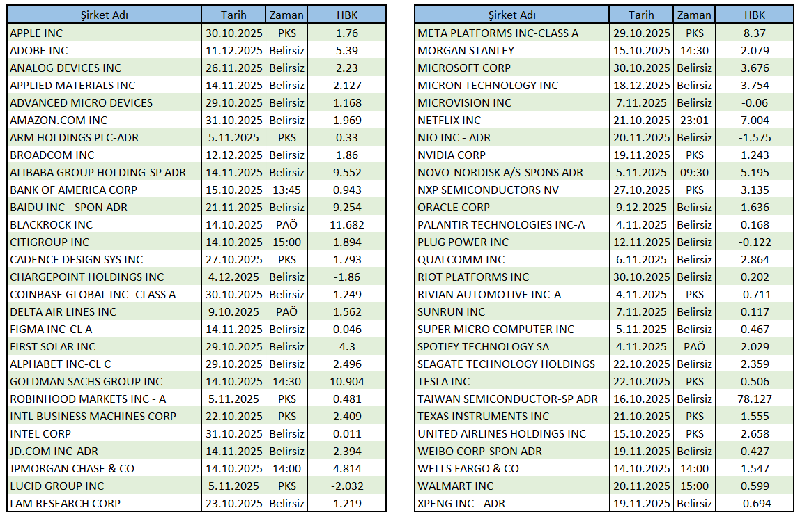 *PAÖ (Piyasa Açılışı Öncesi), PKS (Piyasa Kapanışı Sonrası) ve tabloda yer alan saatler, Bloomberg’in verilerinden elde edilmektedir. İlgili veriler değişiklik gösterebilir.