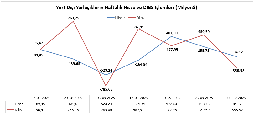 29 Eylül – 3 Ekim haftasında yurt dışında yerleşik kişilerin piyasa fiyatı ve kur hareketlerinden arındırılmış hisse senetleri net değişimi -84 milyon 120 bin dolar olarak gerçekleşirken yurt dışında yerleşik kişilerin piyasa fiyatı ve kur hareketlerinden arındırılmış DİBS (Kesin Alım) net değişimi -358 milyon 520 bin dolar olarak gerçekleşti.