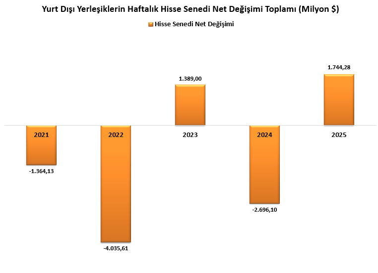 Yıllık bazda hisse senedi net değişimlerine ayrıca bakıldığında ise yabancıların 2021 ve 2022 yılında hisse senetlerinde satım gerçekleştirdiği, 2023 yılında alım tarafında yer aldıkları görülmektedir. 2024 yılının ise 2021 ve 2022’ye benzer şekilde net satım ile negatif tarafta sonlandığı görülmüştür. Diğer yandan 2025 yılının başından itibaren 3 Ekim ile biten haftayla birlikte hisse senetlerinde 1,74 milyar dolarlık alım gerçekleştiği görülmektedir.