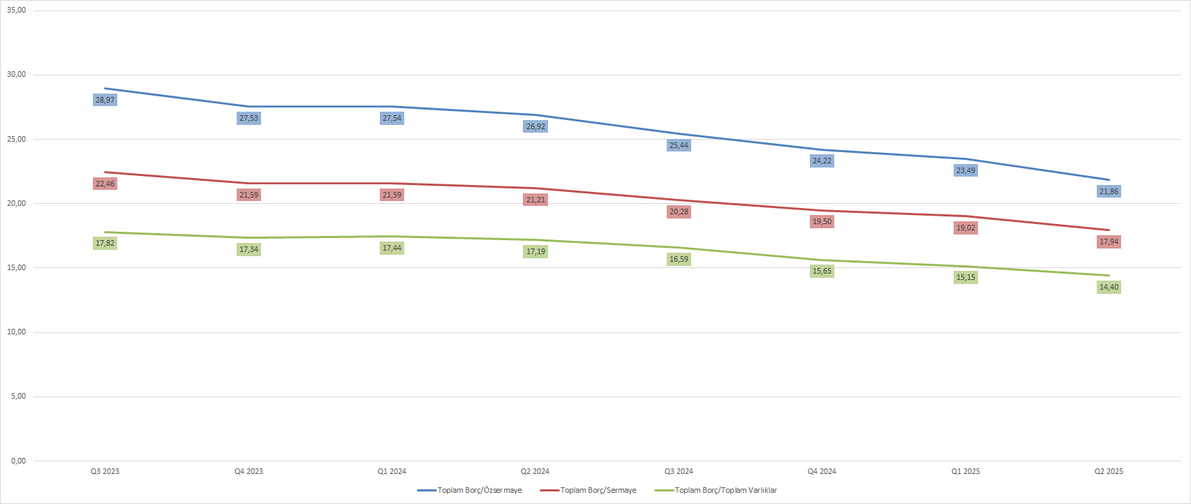 TSM’in sermayesine, öz sermayesine ve toplam varlıklarına oranla; toplam borcu azalan bir eğilim çiziyor. Toplam borç / öz sermaye oranı %21,86’ya; toplam borç / sermaye oranı %17,94’e ve toplam borç / toplam varlıklar oranı ise %14,4’a düşüş gösterdi.
