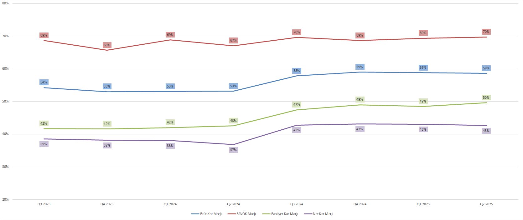Şirketin marjlarında yükseliş eğiliminin korunduğu bir çeyrek geride kaldı. Brüt kar marjı %58,6 ile karşımıza çıkarken, FAVÖK marjı %69,77 oranında elde edildi. Faaliyet kar marjı yıllık bazda %16,6 artışla %49,6 oranında ve net kar marjı %15,9 büyüyerek %42,6 oranıyla karşımıza çıktı. TSM’in yıllıklandırılmış FAVÖK marjı %68,58 ile benzerlerinin arasındaki en yüksek değere sahip olduğu söylenebilir. İlerleyen tablolarda bu durumu görebilirsiniz.