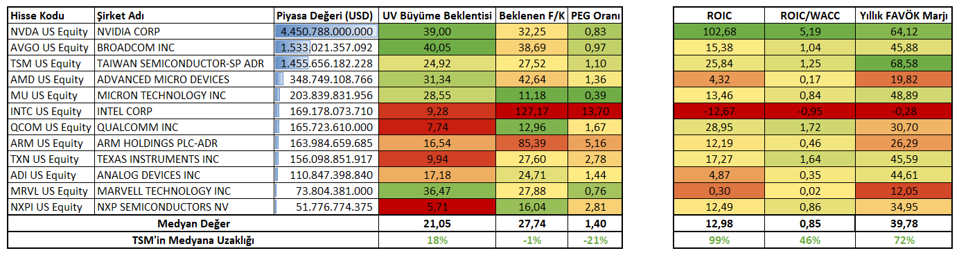Aynı zamanda TSM’in ROIC değerini, şirketin ağırlıklı ortalama sermaye maliyetine (WACC) oranladığımızda, 1,25 değeri hem 1 seviyesi üzerinde olmasıyla ekonomik değer açısından pozitif bir durumu hem de benzerlerinin medyanı 0,85’in üzerinde olmasıyla benzerlerinden pozitif ayrıştığını gösteriyor. İlerleyen tablolarda bu durumu görebilirsiniz.