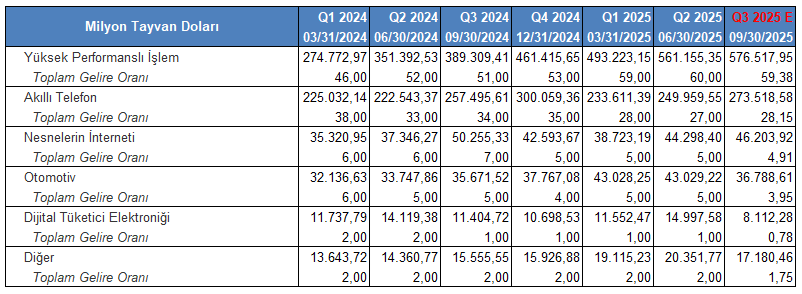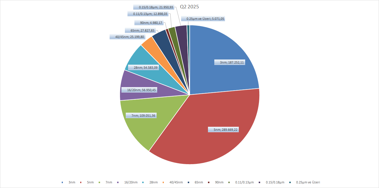 Çiplerin boyutu küçüldükçe, transistör sayısı, enerji tüketimi ve veri iletim hızı gibi alanlarda verimlilik artışı elde ediliyor. Şirketin üretiminde büyük bölüm, görece küçük sayılan 3 – 5 ve 7 nanometre boyutundaki çiplerden oluşuyor. Bu en küçük üç boyuttaki çiplerden elde edilen gelir, 2025 yılı ikinci çeyreğinde toplam çip gelirlerinin %74’ünü oluşturuyor ve bu durum giderek yükselen bir eğilim sergiliyor.