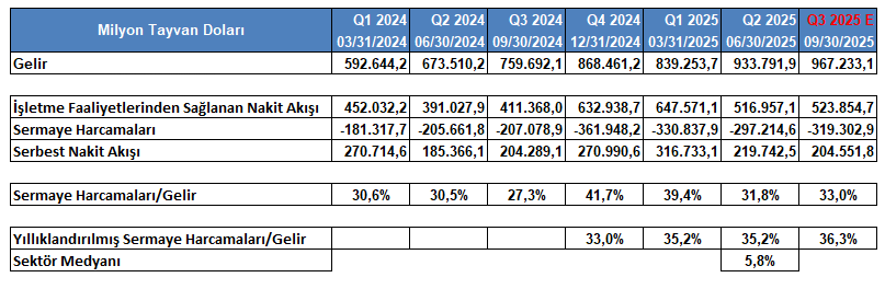 Yıllıklandırılan verilerle sermaye harcamalarını gelire oranladığımızda; bu dönemde TSM’in %35,2’lik oranı sektördeki benzerlerinin medya değeri %5,8 oranının oldukça üzerinde bulunuyor. Bu durum şirketin, benzerlerine göre, büyümeye odaklandığının bir göstergesi olarak karşımıza çıkabilir.