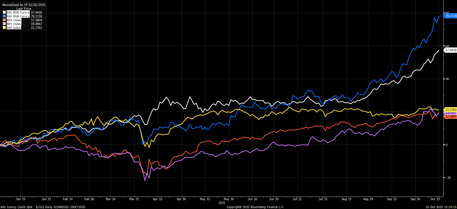 Grafikte 2 Ocak 2025 tarihi baz alınarak normalize edilmiş altın (XAU/USD), gümüş (XAG/USD) ve üç büyük hisse endeksi Nasdaq 100 (NDX), Nikkei 225 (NKY) ve DAX 40 (DAX) performansları görülüyor.