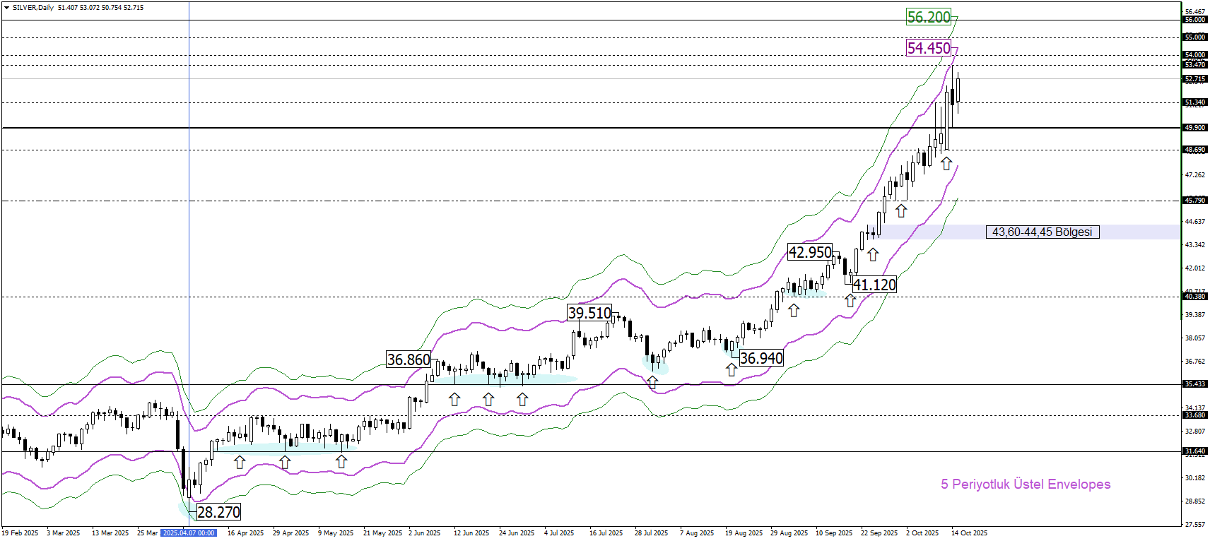 4 Temmuz’dan bu yana düşüş yönlü kırılım yaşamadan yukarı yönlü eğilimini sürdüren gümüş, 49,90 seviyesi üzerindeki seyrini koruyarak pozitif görünümünü koruyor.