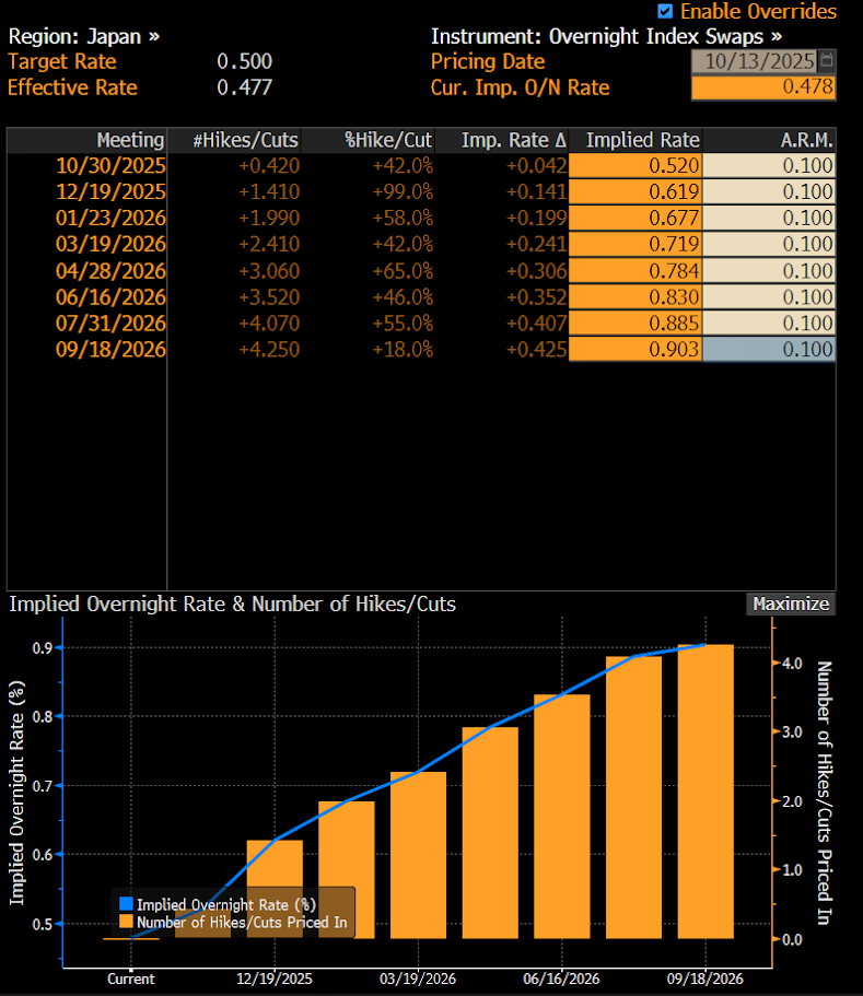 Faiz Görünümü: Bloomberg WIRP verilerine göre piyasa, Japonya Merkez Bankası tüm Japonya’daki güncel duruma rağmen Aralık ayında 14 baz puan faiz artışı kesin gözüyle bakılıyor. Ekim toplantısı güçlü bir ihtimal var, kesin olmasa da hala masada. Bu durum, BoJ’un ultra gevşek politikadan kademeli çıkış beklentisinin güçlendiğini gösteriyor. BoJ’un politika faizini %0,5’te sabit tuttuğu, enflasyonun %2,7 seviyelerinde seyrettiği ve büyümenin zayıf kaldığı bir ortamda, döviz müdahalesi, faiz artışına alternatif olarak öne çıkıyor.