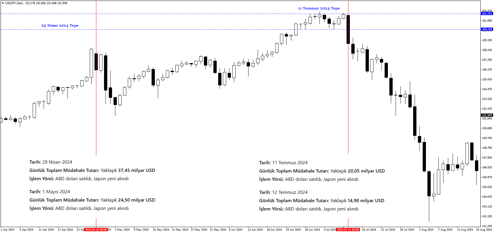 Müdahele Geçmişi: Japonya, Mayıs 2024’te yaklaşık 63 milyar dolarlık döviz müdahalesiyle 2022 sonrası ilk resmi adımını attı. 2022’de Eylül’de 19,7, Ekim’de ise 42,3 milyar dolarlık benzer müdahaleler yapılmıştı. 2011’de ise deprem ve tsunamiden bir hafta sonra, 18 Mart’ta Yen’i zayıflatıp USDJPY paritesini yükseltmek amacıyla yaklaşık 13 milyar dolarlık müdahale yapıldı. Bu tür adımlar genellikle kısa vadeli etki yaratıyor, ancak kalıcı sonuçlar sınırlı kalıyor. Nitekim 2024’teki müdahale sonrası USDJPY kuru 160 seviyesinden gerilese de kısa sürede yeniden aynı seviyelere çıktı. Kurun tekrar 160’a yaklaşması yeni bir müdahale olasılığını gündeme getirirken piyasa artan volatiliteyle süreci yakından izliyor.