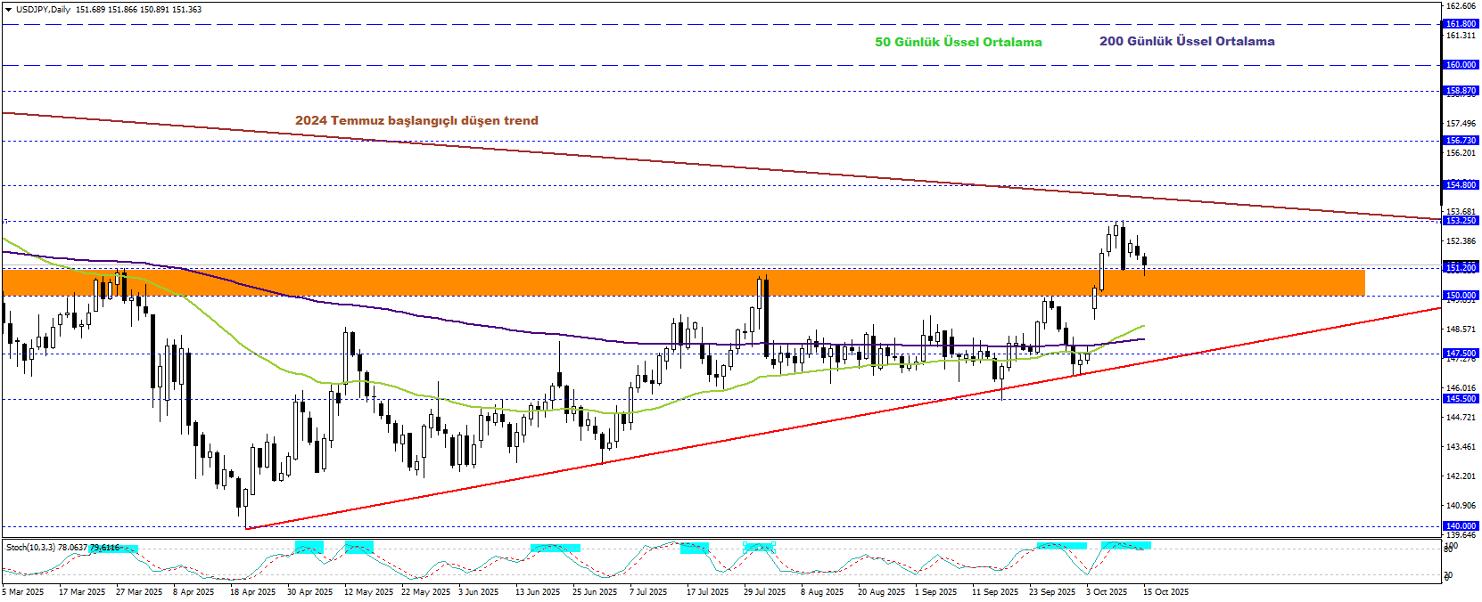 Bununla birlikte, kısa vadede düzeltme riskleri de göz ardı edilmemeli. Özellikle Stochastic göstergenin mavi kutularda da işaretlendiği üzere aşırı alım bölgesinde bulunması kısa vadede olası bir düzeltmenin habercisi olabilir ya yükseliş temposunda yavaşlama ihtimaline işaret ediyor. Bu tür bir senaryoda, 150,00 – 151,20 bölgesi güçlü bir eşik olarak öne çıkıyor. Bu seviyenin altına sarkılması trend çizgisine kadar geri çekilmeyi destekleyebilir. Ayrıca, 160,00 seviyesi civarında Japonya Merkez Bankası'nın müdahale etme riski göz önünde bulundurulmalı.