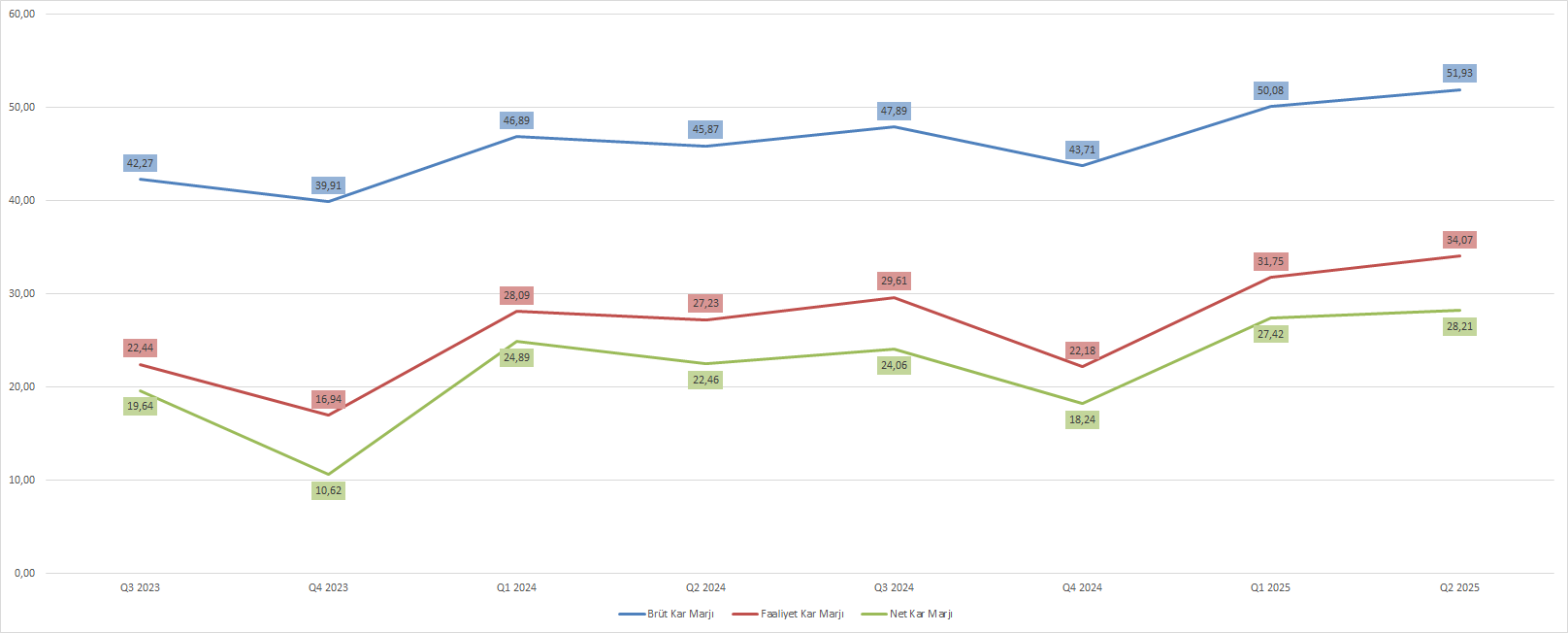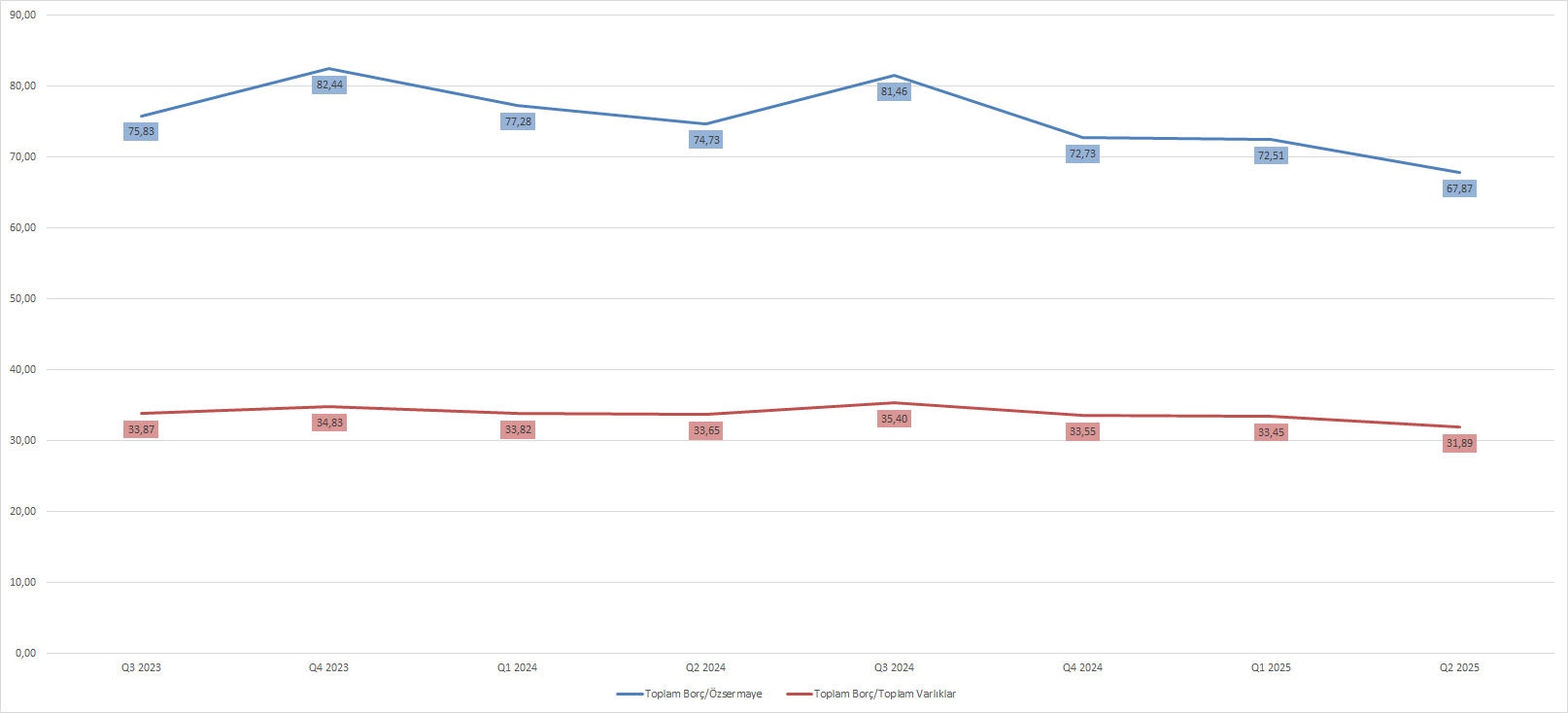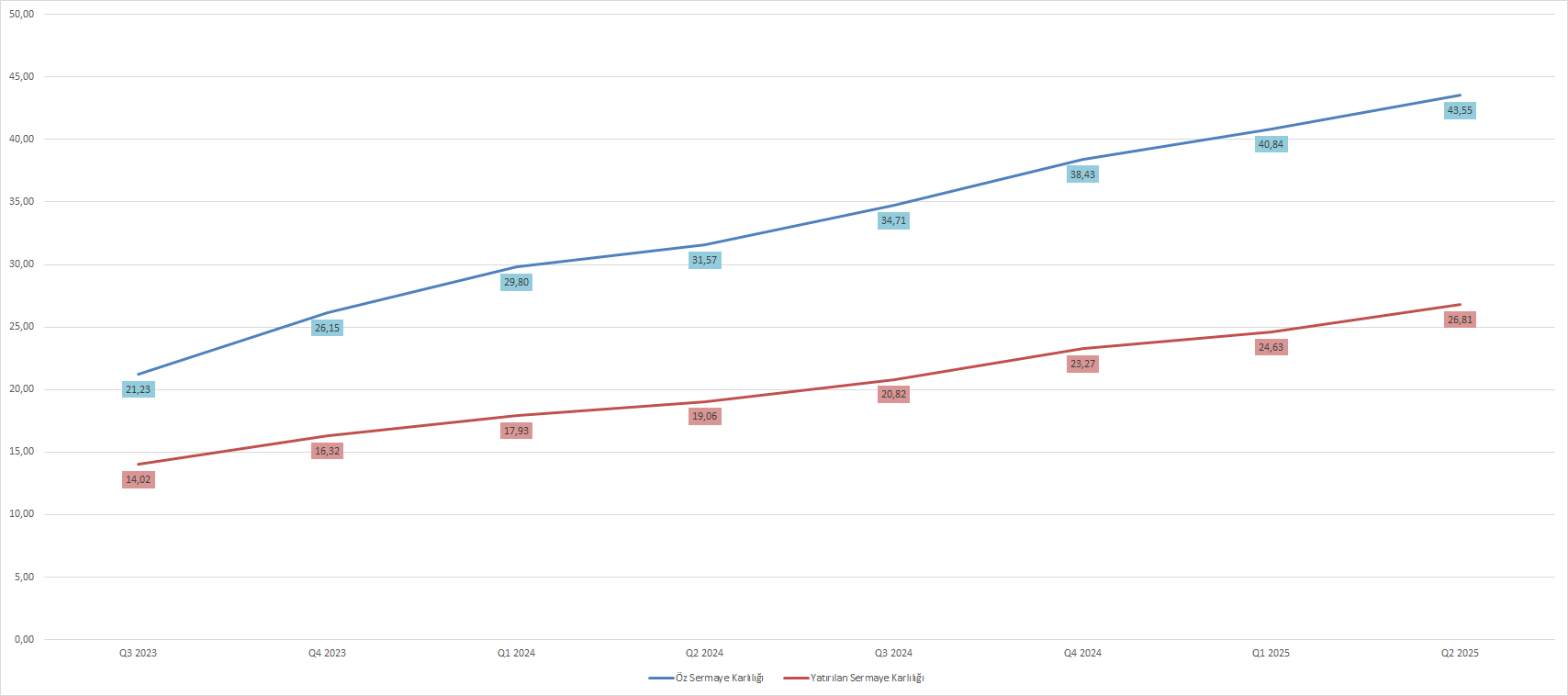 Net kardaki güçlü seyir, şirketin bu 2025 yılı ikinci çeyreğindeki karlılık oranlarındaki yukarı yönlü eğilimin korunmasına alan açtı. Öz sermaye karlılığı %37,9 oranında yıllık bazda artışla, %43,55 oranına yükseldi. Yatırılan sermaye karlılığı ise %40,6 oranında yıllık değişimle, %26,81 oranında karşımıza çıktı.