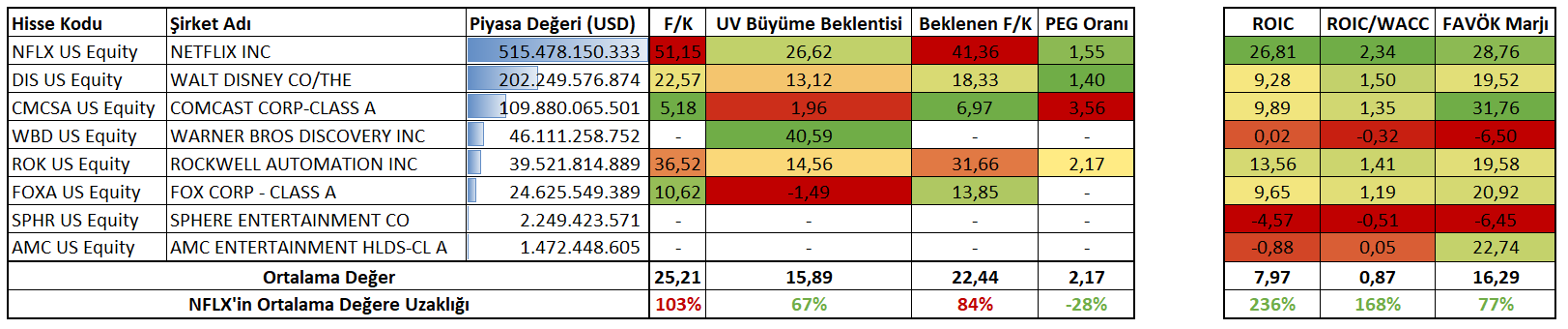 Şirketin fiyat / kazanç oranı 51,15 oranı ile benzerleri arasında en yüksek değere işaret ediyor. Netflix’e yönelik uzun vadeli büyüme beklentisi %26,62 oranıyla ortalama değerin üzerine işaret ederken; beklenen fiyat / kazanç oranı %41,36 oranıyla en yüksek oranda bulunuyor. Netflix’in PEG oranı 1,55 ile ortalamanın %28 oranında daha düşük hesaplanıyor.