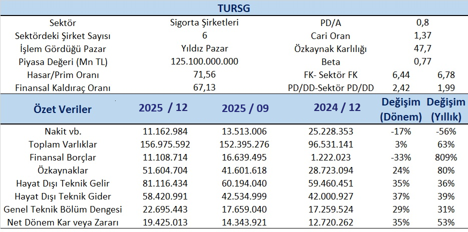 TURSG’nin aktifleri bir önceki yılın aynı dönemine göre %72 artarken 2025/2. Çeyreğine göre de %9,4’lük artış göstermiş olup dönemlerine göre enflasyonun üzerinde bir artış göstermiştir. Finansal Borçlar ise 2024/3’e göre %998 2025/2’e göre ise %64’lük bir artış göstermiştir. Ayrıca sigortacılık sektöründe önemli bir kalem olan Özkaynaklar ise dönemsel yıllıkta (2024/3 den) %73’lük ikinci çeyreğe göre de %14’lük bir artış göstermiştir. Ayrıca TURSG’nin özkaynak karlılığı da 2025/2 çeyreğe göre %32,43’den %53’e çıktığı görülmektedir. Nominal olarak yaklaşık olarak 5 Milyar TL ile branşında ve rakipleri arasında en yüksek karlılığa sahip firma olacağı beklenmektedir.