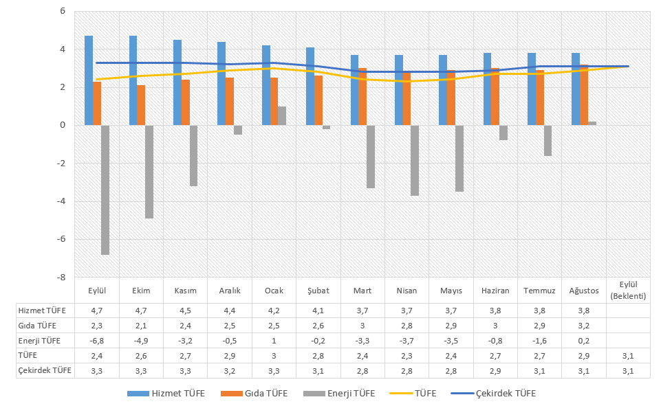 Yukarıdaki grafikte enflasyonun son bir yıllık dönemdeki seyri görülebilir. Yılın ilk yarısında manşet enflasyonda daha ılımlı, çekirdek enflasyonda zoraki ilerleyen ılımlı seyir, yerini tekrar katılığa bıraktı. Tarifelerin satış fiyatlarına yansımasının geçici olacağı görüşü doğru olabilir; ancak bunun zamanlaması konusunda fikir ayrılıkları var. Sonu itibariyle, yine grafikte görülebileceği gibi çekirdek enflasyonun 3,1% bölgesinde katılığını koruması, manşet enflasyonun ise Mayıs 2024’ten sonra tekrar 3% üzerine çıkması bekleniyor.
