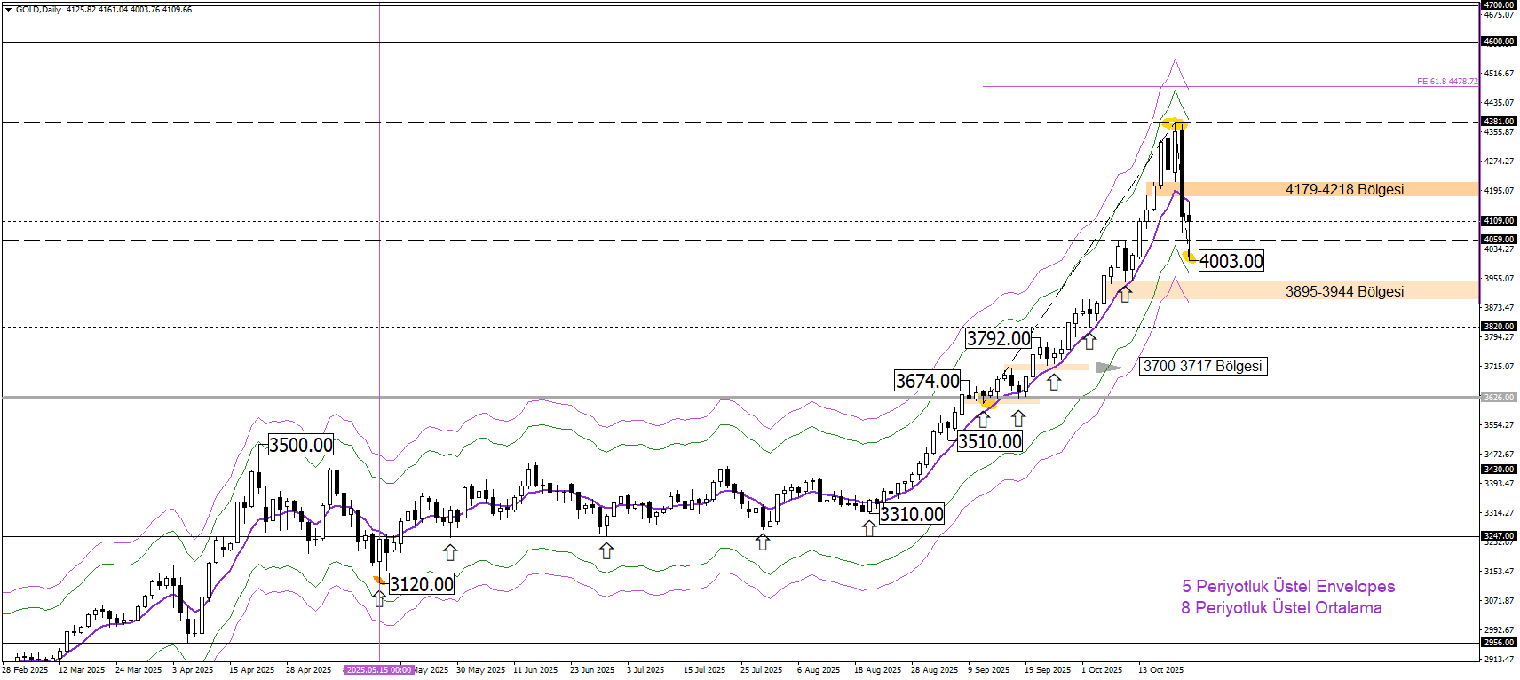 Destekleyici Faktörler: ABD–Çin arasındaki ticari gerilimler ve ABD hükümetinin kapalı kalma sürecinin uzaması gibi belirsizliği artıran durumlar altın fiyatlarını desteklemeye devam edebilir. 24 Ekim’de açıklanacak enflasyon verisinde azalış gözlemlenmesi altını destekleyebilir.