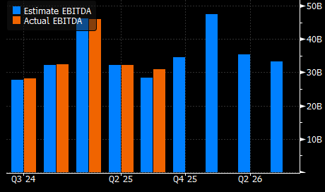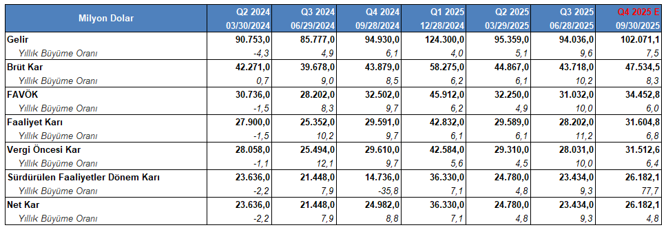 FAVÖK’ün 34,45 milyar Dolar tutarında kaydedilmesi düşünülüyor. En yüksek beklenti 36,33 milyar Dolar ve en düşük beklenti 32 milyar Dolar ile yer alıyor. Piyasa beklentisinin karşılanması halinde, FAVÖK yıldan yıla %6 oranında artış yaşayabilir.