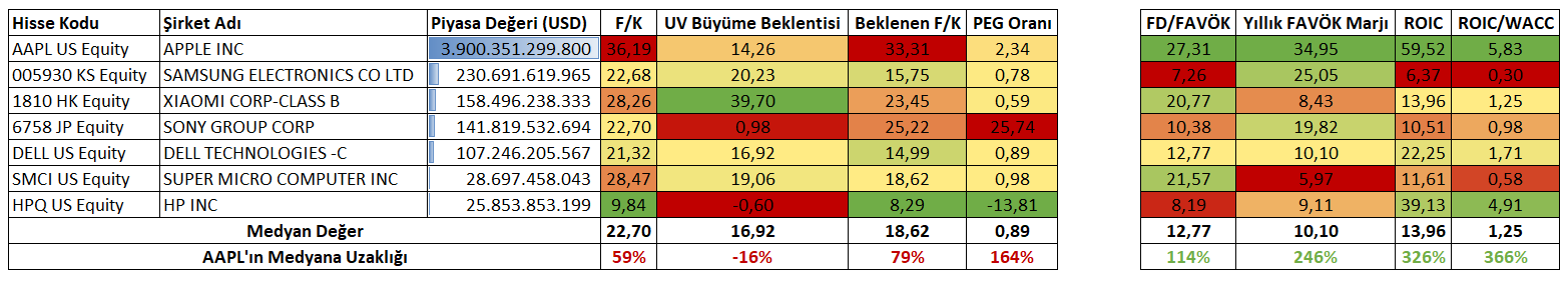 Şirketin cari fiyat / kazanç oranı 36,19 oranı ile benzerlerinin medyan değerinden yüksek hesaplanıyor. Şirkete yönelik uzun vadeli büyüme beklentisi %14,26 ile medyan değerin altında yer alırken, şirketin beklenen F/K oranı da 33,31 ile yine medyan değerden yukarıda bulunuyor. Apple’ın PEG oranı 2,34 ile benzerlerinin üzerinde yer alıyor.