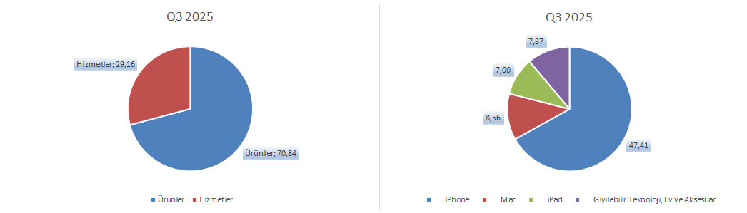 Apple’ın ürün segmenti, mali 2025 yılı üçüncü çeyreklik döneminde 66 milyar 613 milyon Dolar gelir üreterek, toplam gelirini %70,84’ünü temsil etti. Toplam gelirin geriye kalan %29,16’lık kısmı, 27,423 milyar Dolar ile hizmetler tarafından elde edildi.