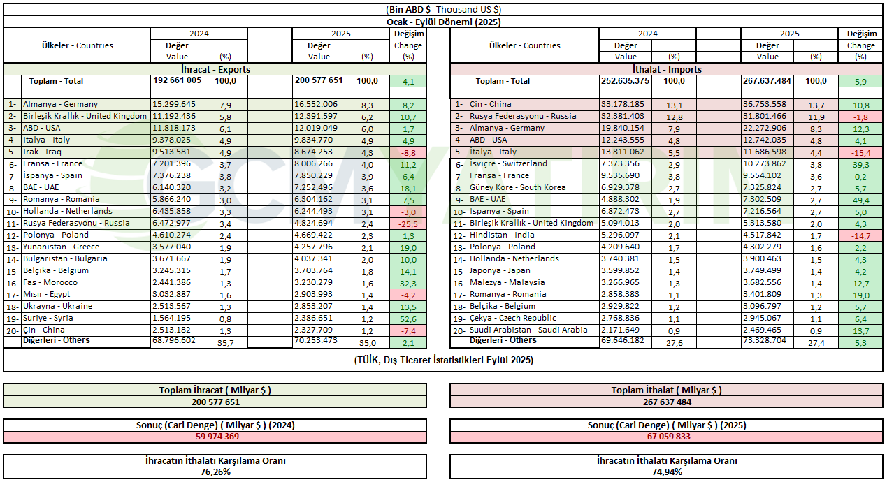TÜİK’in her ayın sonunda açıklamış olduğu Dış Ticaret İstatistikleri’ne göre Ocak - Eylül 2025 döneminde en çok ihracat ve ithalat yapılan 20 ülke aşağıdaki tabloda belirtilmiştir.