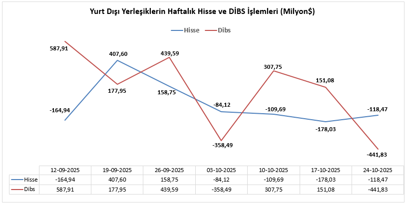 20 - 24 Ekim haftasında yurt dışında yerleşik kişilerin piyasa fiyatı ve kur hareketlerinden arındırılmış hisse senetleri net değişimi -118 milyon 470 bin dolar olarak gerçekleşirken yurt dışında yerleşik kişilerin piyasa fiyatı ve kur hareketlerinden arındırılmış DİBS (Kesin Alım) net değişimi -441 milyon 830 bin dolar olarak gerçekleşti.