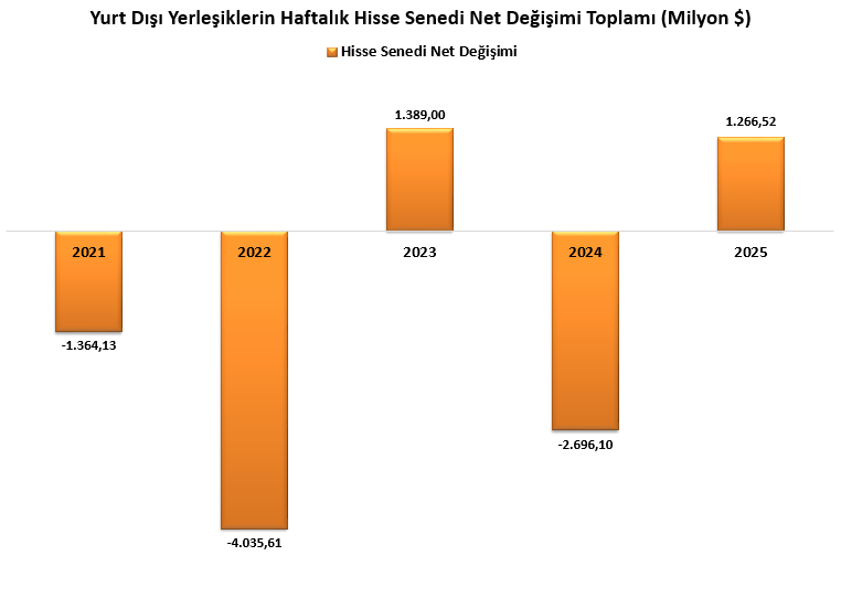 Yıllık bazda hisse senedi net değişimlerine ayrıca bakıldığında ise yabancıların 2021 ve 2022 yılında hisse senetlerinde satım gerçekleştirdiği, 2023 yılında alım tarafında yer aldıkları görülmektedir. 2024 yılının ise 2021 ve 2022’ye benzer şekilde net satım ile negatif tarafta sonlandığı görülmüştür. Diğer yandan 2025 yılının başından itibaren 24 Ekim ile biten haftayla birlikte hisse senetlerinde 1,26 milyar dolarlık alım gerçekleştiği görülmektedir.