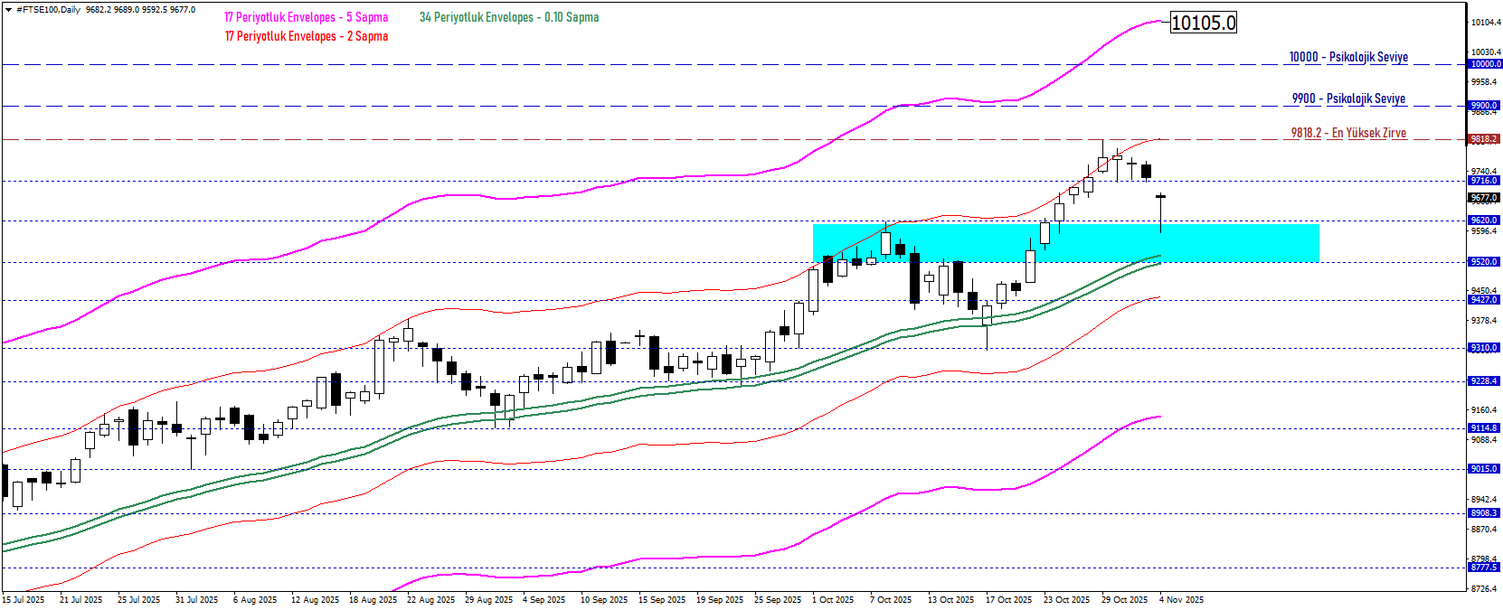 FTSE100 endeksi, Nisan ayından bu yana sürdürdüğü yükseliş trendini güçlendirerek teknik görünümünü sağlamlaştırdı. 34 periyotluk Envelopes göstergesinin üst bandının işaret ettiği 9520 – 9620 bölgesinin üzerinde kalıcılık korundukça, endeksin üst sınır olan 10105 seviyesine doğru yükselişini sürdürmesi beklenebilir. Endeksin özellikle mevcut en yüksek zirvesini aşması, yukarı yönlü ivmeyi destekleyerek hareket alanını genişletebilir.