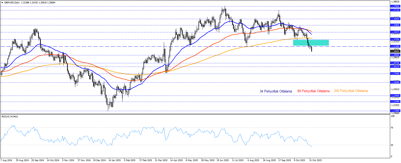 GBPUSD paritesi, Eylül ortasından bu yana sürdürdüğü düşüş trendiyle negatif teknik görünümünü güçlendirdi. 1,3140 – 1,3250 bölgesinin altında kalındığı sürece, paritenin 1,2870 seviyesine doğru geri çekilme eğilimini sürdürmesi beklenebilir. Paritenin 34 periyotluk ortalamayı direnç olarak kullanması dikkat çekerken, 89 periyotluk ortalama ile aşağı yönlü kesişim, mevcut baskıyı destekliyor. RSI göstergesinin aşırı satım bölgesinde bulunması ise kısa vadede tepki alımlarının gelebileceğine işaret ediyor.