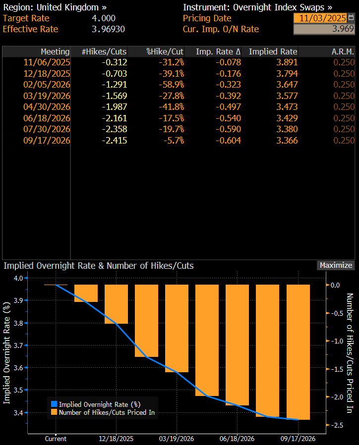Para Politikası Görünümü: Swap piyasaları Kasım için %30, Aralık için %40 oranında 25 baz puan indirim fiyatlıyor. Önceki toplantıda 9 üyeden yalnızca 2’si indirim oyu kullanmıştı. Kasım’da 3 üyenin indirim lehine oy vermesi beklenirken, sayı 4’e çıkarsa güvercin sinyaller GBPUSD’yi aşağı, FTSE 100’ü yukarı taşıyabilir. BoE sıkı politikadan kademeli gevşemeye yöneliyor. Çekirdek enflasyon %3,5’e geriledi, işsizlik artışı yavaşladı. Bu gelişmeler 2026’da 2 ila 3 indirim beklentisini güçlendiriyor. İndirim umutları GBPUSD’yi baskılayabilirken, FTSE100 endeksini yukarı yönlü destekleyebilir.