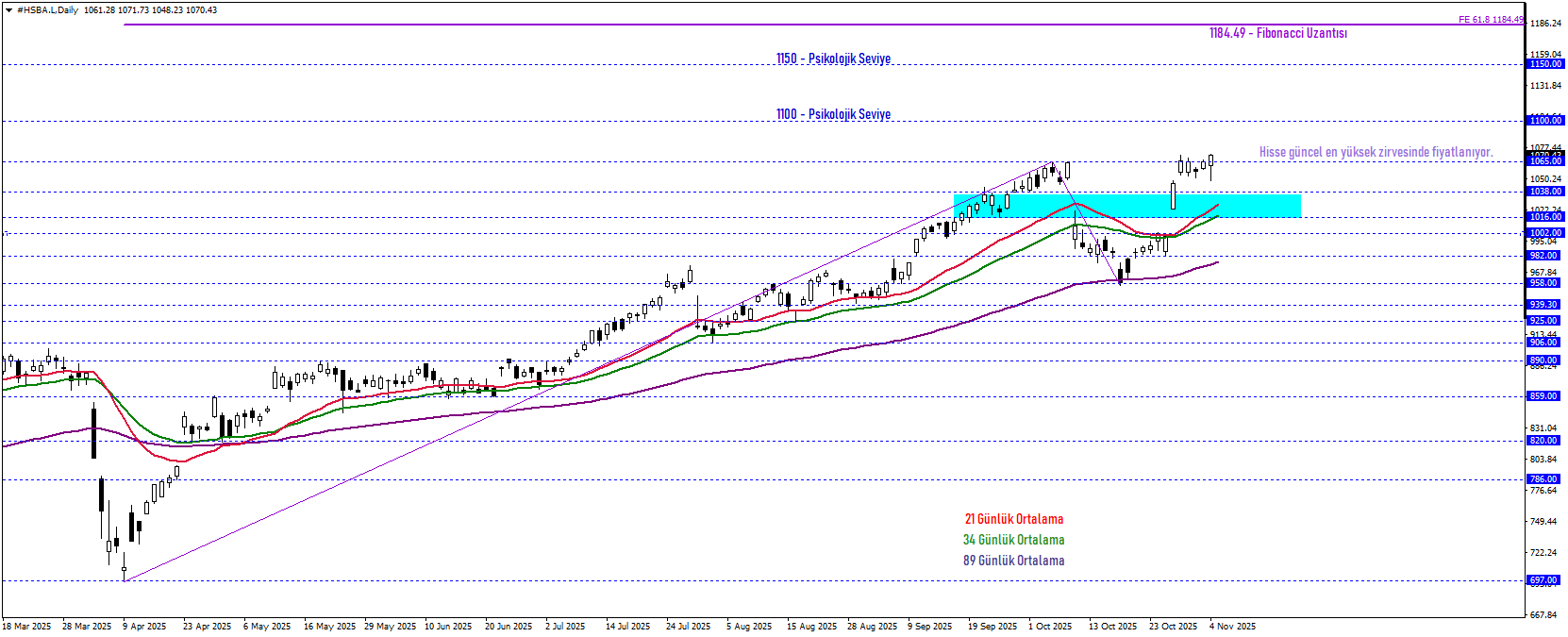 Endeksin lider bankalarından HSBC, 2020'nin son çeyreği itibarıyla olumlu bir performans sergilerken kısa vadede yeni en yüksek tepeler oluşturarak bu pozitif momentumu pekiştirmeye devam ediyor. 34 ve 21 periyotluk hareketli ortalamaların da desteklediği 1016 – 1038 bandının üzerinde kalıcılık devam ettiği sürece, Fibonacci Uzantısı'nın 61.8 oranı olan 1184 hedefine yönelik yükseliş eğilimini koruması öngörülebilir. Faiz indirimlerine ilişkin beklentilerin güçlenmesi, hisse senedinin yukarı yönlü hızını artırarak potansiyel hareket aralığını genişletebilir.