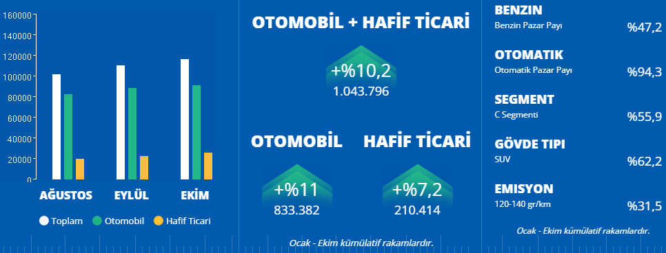 Türkiye otomobil ve hafif ticari araç toplam pazarı, 2025 yılı Ocak-Ekim döneminde bir önceki yılın aynı dönemine göre %10,20 oranında artarak 1.043.796 adet olarak gerçekleşti. Otomobil satışları, 2025 yılı Ocak-Ekim döneminde geçen yıla göre %10,98 oranında artarak 833.382 adet, hafif ticari araç pazarı ise %7,23 artarak 210.414 adet oldu.