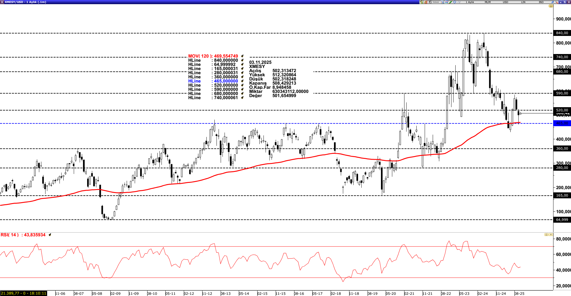 Teknik Bakış; Son dönemde 590 dolar seviyesinden satış baskısı gören sektör, 120 aylık ortalamanın geçtiği 465 dolar seviyesinde destek buldu. Yukarı yönlü hareketin sürdürülebilmesi açısından 520 dolar seviyesinin üzerinde kalıcılık önemini koruyor. Bu seviyenin aşılması durumunda, fiyatın yeniden 590 dolar direnç seviyesine doğru ivme kazanması beklenebilir. Öte yandan, olası aşağı yönlü baskılarda 120 aylık ortalama seviyesi güçlü bir destek konumunda bulunuyor. Ancak bu seviyenin altına sarkılması halinde, realizasyon süreci derinleşerek 360 dolar seviyesinin gündeme gelme riskini artırabilir.