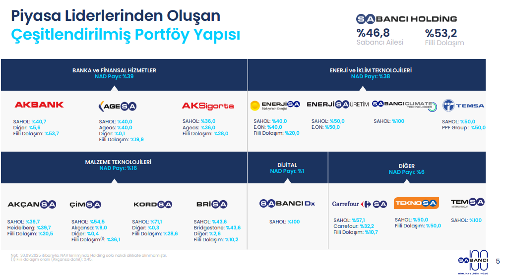 Sabancı Holding’in hedef fiyat çalışmasında, 2025/09 dönemi itibarıyla yalnızca borsada işlem gören iştirakler dikkate alınarak SOTP (Sum of the Parts) yöntemine dayalı piyasa bazlı Net Aktif Değer (NAD) analizi gerçekleştirilmiştir.Analiz kapsamında, iştiraklerin güncel piyasa değerleri üzerinden Sabancı Holding’in portföy değeri hesaplanmış, ardından konsolide borçluluk ve nakit pozisyonu etkisi dikkate alınarak toplam piyasa bazlı NAD yaklaşık 380 milyar TL olarak sonuçlanmıştır. Güncel ödenmiş sermaye esas alındığında, hisse başına NAD değeri 180 TL seviyesindedir. Bu sonuç, Sabancı Holding hisselerinin, iştiraklerinin toplam piyasa değerine göre yaklaşık %56 NAD iskontosuyla işlem gördüğünü göstermektedir.