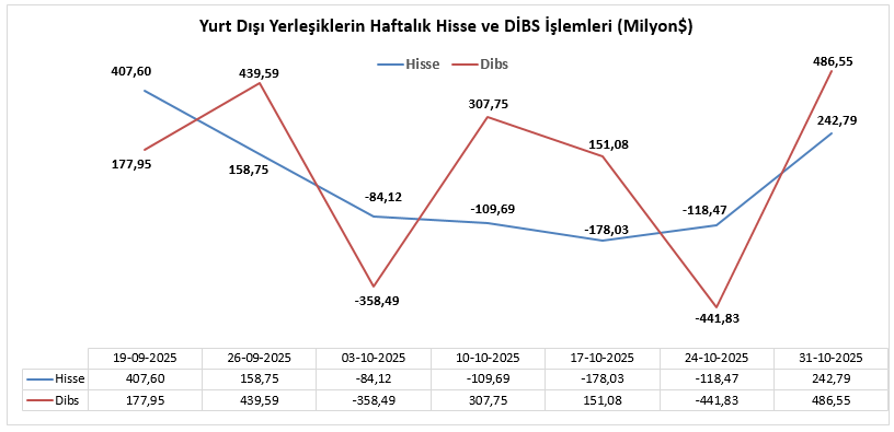 27 - 31 Ekim haftasında yurt dışında yerleşik kişilerin piyasa fiyatı ve kur hareketlerinden arındırılmış hisse senetleri net değişimi 242 milyon 790 bin dolar olarak gerçekleşirken yurt dışında yerleşik kişilerin piyasa fiyatı ve kur hareketlerinden arındırılmış DİBS (Kesin Alım) net değişimi 486 milyon 550 bin dolar olarak gerçekleşti.