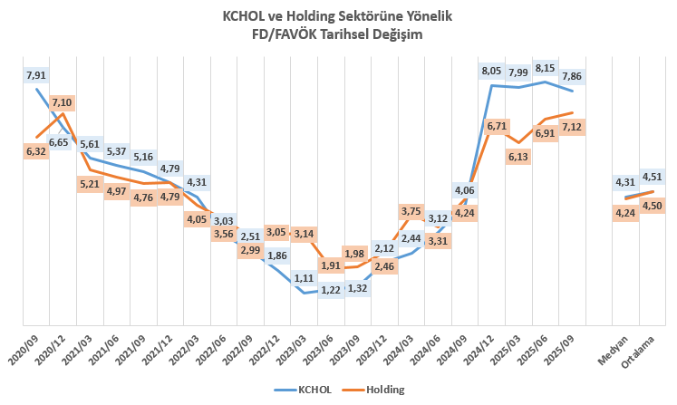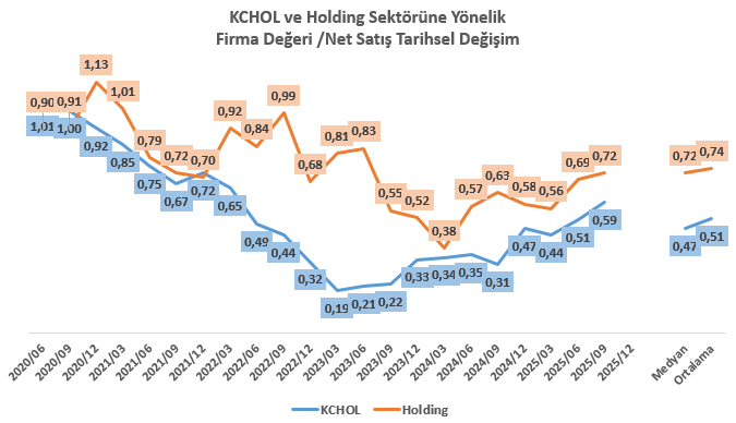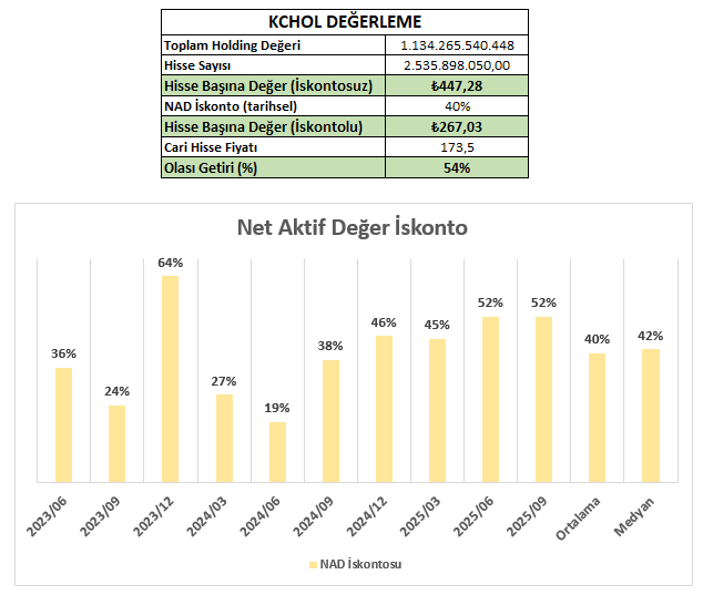 Bu tutar, mevcut ödenmiş sermaye esas alındığında, hisse başına iskontosuz NAD değerini model tarafından hesaplanan 447,28 TL seviyesinde göstermektedir. Ancak, 2023/06 – 2025/09 dönemleri dikkate alındığında, Koç Holding hissesi tarihsel olarak ortalama %40 NAD iskontosu ile işlem görmüştür. Bu oran baz alındığında, revize edilmiş hedef fiyat 267,03 TL seviyesine denk gelmektedir.