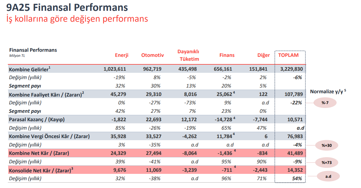 2025 yılı üçüncü çeyreğinde toplam kombine gelirlerini yıllık bazda %1 artışla 1,15 trilyon TL seviyesinde gerçekleştirdi. Segmentler bazında bakıldığında, enerji grubu yüksek kapasite kullanımı ve operasyonel verimlilikle %14 artış kaydeden faaliyet karı sayesinde konsolide sonuçlara en güçlü katkıyı verdi. Otomotiv segmentinde gelirler %17 artarken, artan elektrikli araç payı ve fiyat rekabeti faaliyet karlılığındaki artışı sınırladı.