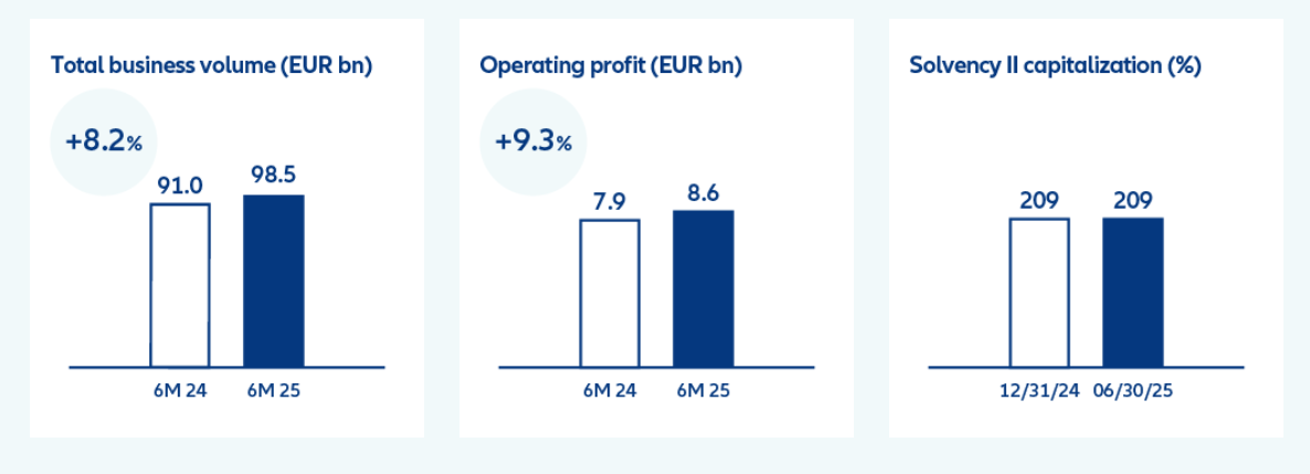 Allianz ALV, 14 Kasım Q3 bilançosu öncesi 350 seviyelerinde konsolide olurken, Q2’de gelirin 44,5 milyar €’ya (yaklaşık %10 artış) ve faaliyet karının 8,6 milyar €’ya yükselmesi yıllıkta yaklaşık %20 getiriyi destekledi. Grafikte de görüldüğü gibi, şirket 2025’in ilk yarısında toplam iş hacmini %8,2 artırarak 98,5 milyar avroya yükseltti. Faaliyet kArı da %9,3 artışla 8,6 milyar avroya ulaşarak güçlü operasyonel performansı ortaya koydu. Sermaye yeterliliği oranı ise %209 seviyesinde sabit kalarak finansal istikrarın korunduğunu gösterdi.
