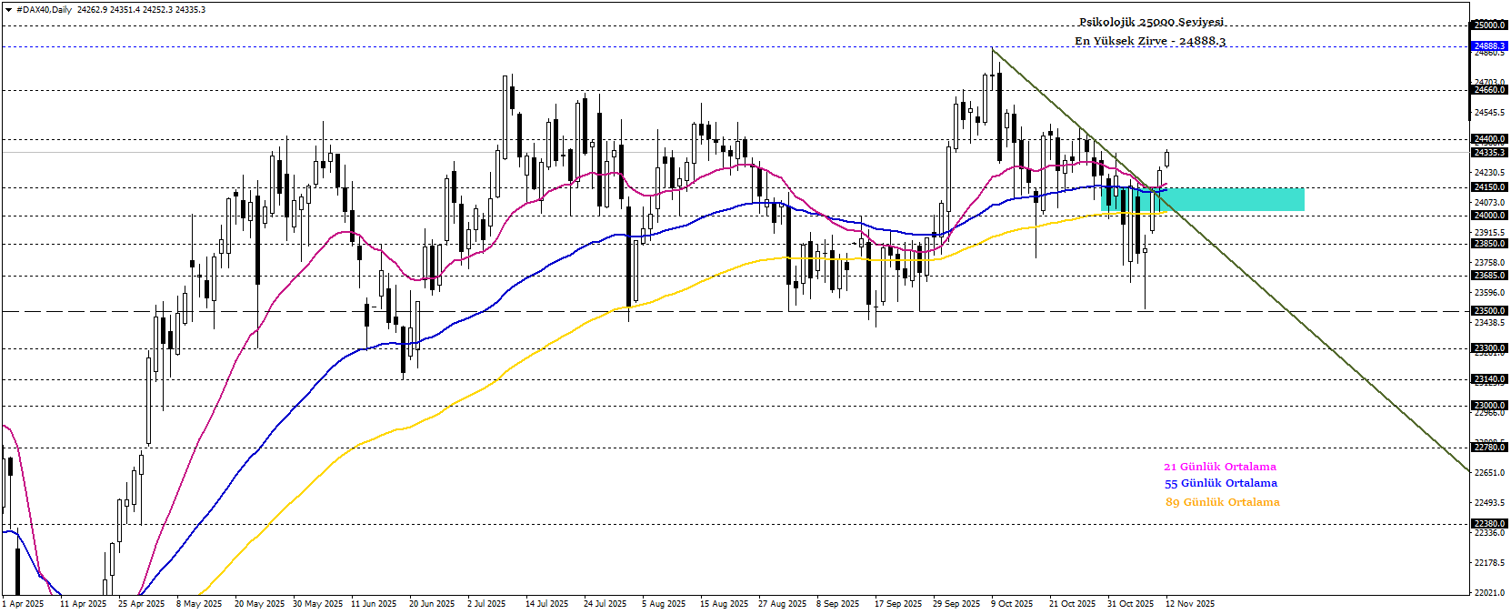 DAX40 endeksi teknik görünümde 24350 seviyelerinde pozitif bölgede fiyatlanmayı sürdürüyor. Endeksin 24150 – 24000 bölgesi ve üzerinde kaldığı sürece en yüksek zirvesi 23888,30 seviyesine doğru hareket potansiyelini koruması beklenebilir. Buna karşılık, olası baskılarda 24.000 – 24150 bölgesinin altındaki kalıcılık endeksin 23.500 seviyesine doğru geri çekilmesine neden olabilir.