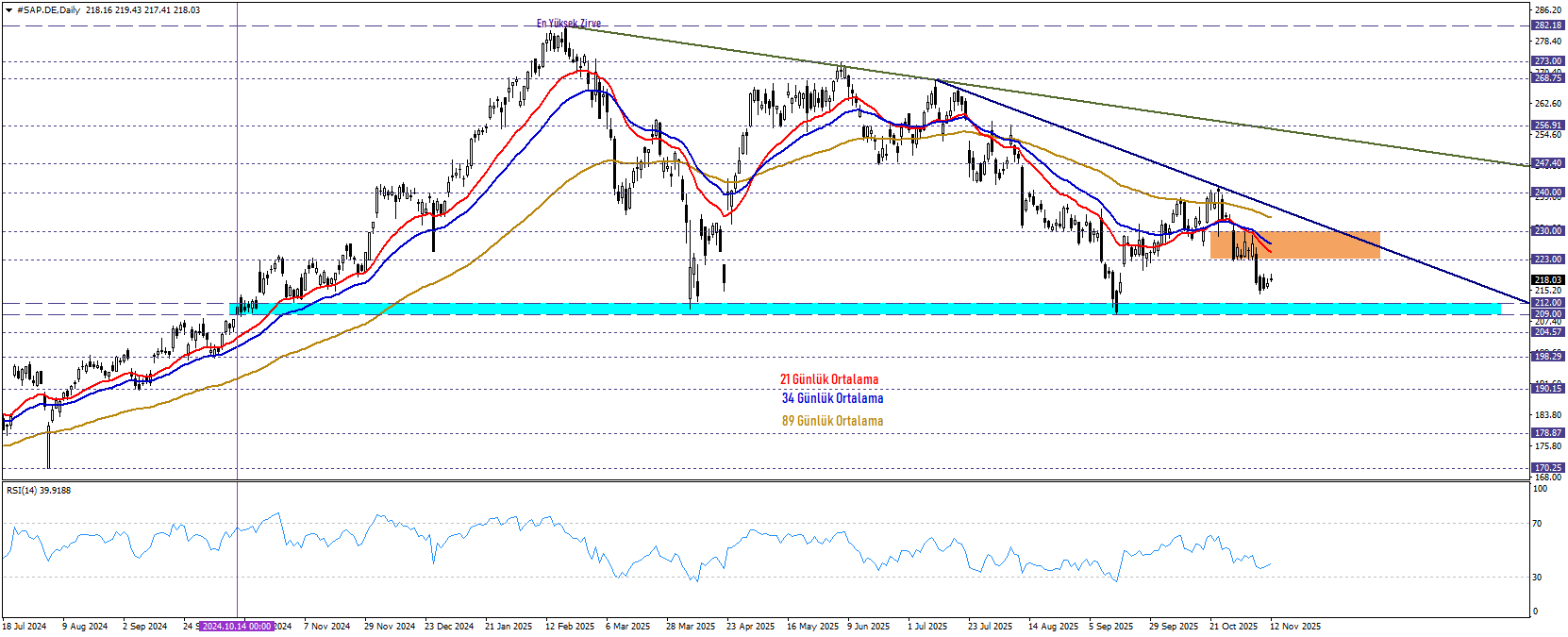 SAP, son 6 ayda yaklaşık yüzde 17 gerileme ila dikkat çekereken olumsuz görünümünü sürdürüyor. Hisse, 223,00 – 230,00 bölgesi altında kalındığı sürece, hisse 170,00 seviyesine doğru hareketini sürdürebilir. Ortalamaların aşağı yönlü kesişimi dikkat çekerken düşüşlerde takip edilen bölge eşik görevi görüyor. Özellike 209,00 seviyesinin altında kalıcılık sağlaması düşüşü derinleştirebilir. Öte yandan SAP 2024 ekim ayından beri 209,00 – 212,00 bölgesinden tepki görerek kısa vadeli yükseliş başlatması ile ön plana çıkarken RSI göstergesi de bu hareketini destekleyerek dikkat çekiyor. Olası tepki hareketlerinde takip edilen bölge eşik görevi ile öne çıkarken geçilmesi durumunda düşüş senaryosu geçerliliğini yitirebilir ve 240 seviyesi hedeflenebilir.