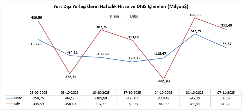 3 – 7 Kasım haftasında yurt dışında yerleşik kişilerin piyasa fiyatı ve kur hareketlerinden arındırılmış hisse senetleri net değişimi 35 milyon 670 bin dolar olarak gerçekleşirken yurt dışında yerleşik kişilerin piyasa fiyatı ve kur hareketlerinden arındırılmış DİBS (Kesin Alım) net değişimi 311 milyon 490 bin dolar olarak gerçekleşti.