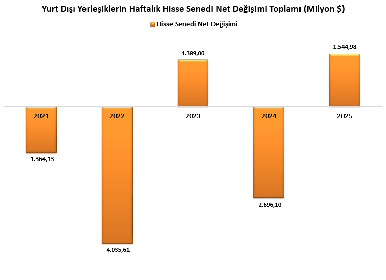 Yıllık bazda hisse senedi net değişimlerine ayrıca bakıldığında ise yabancıların 2021 ve 2022 yılında hisse senetlerinde satım gerçekleştirdiği, 2023 yılında alım tarafında yer aldıkları görülmektedir. 2024 yılının ise 2021 ve 2022’ye benzer şekilde net satım ile negatif tarafta sonlandığı görülmüştür. Diğer yandan 2025 yılının başından itibaren 7 Kasım ile biten haftayla birlikte hisse senetlerinde 1,54 milyar dolarlık alım gerçekleştiği görülmektedir.