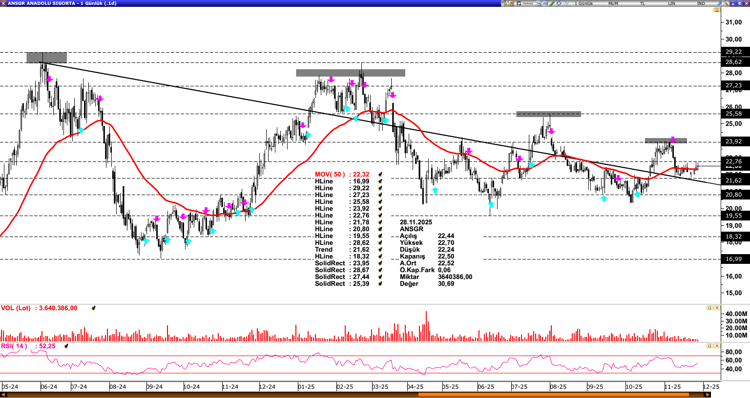 ANSGR: 23,92 direncinden geri çekilme yaşayarak dikkat çeken ANSGR, 50 günlük ortalama (22,32) bölgesinde güç toplamaktadır. Ortalama (22,32) üzerinde fiyatlamaların devam etmesi durumunda tekrardan 23,92 seviyesine yönelik ataklar gerçekleştirebilir. Bu seviyenin de aşılması 25,58 seviyesinin gündeme gelmesini sağlayabilir. Olası baskılanmalarda 21,62 seviyesi kritik destek seviyesi olarak takip edilebilir. Mevcut görünümde 50 günlük ortalama (22,32) üzerinde pozitif görünümün hakim olduğu söylenebilir.