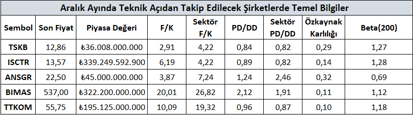 Aralık ayı dinamiklerinde teknik göstergelerle uyumlu çalışabileceğini düşündüğümüz şirketlere yönelik genel düşüncelerimizi raporumuzda ayrıntılı bir şekilde sizlere teknik analiz bölümünde paylaştık. Bu şirketlere yönelik genel bilgilere yukarıdaki tablodan ulaşabilirsiniz.