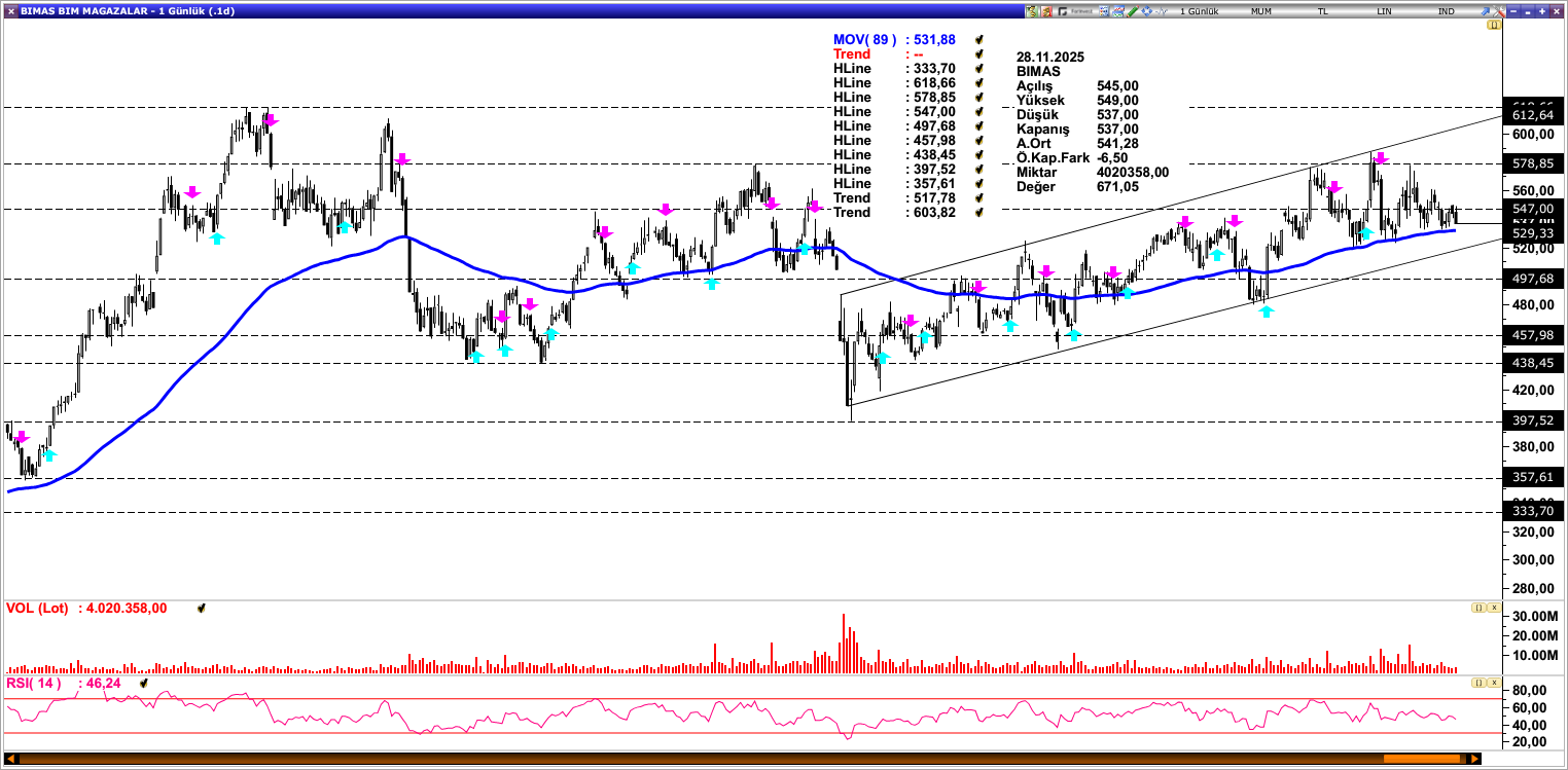 BIMAS: 578,85 seviyesi üzerinde geçemeyerek baskı gören BIMAS, 89 günlük ortalama (531,88) seviyesi üzerindeki pozitif seyrini sürdürmektedir. Ortalama üzerinde kaldığı sürece tekrardan 578,85 direncine yönelik atakları gündeminde tutmaya devam edebilir. Bu direncinden aşılması halinde ise 618,66 seviyesine doğru hareket akışı devam edebilir. Olası geri çekilmelerde 89 günlük ortalama (531,88) ve yükselen trend (517,78) desteği güçlü destek konumunda yer almaktadır. Kırılması halinde realizasyon süreci derinleşebilir.