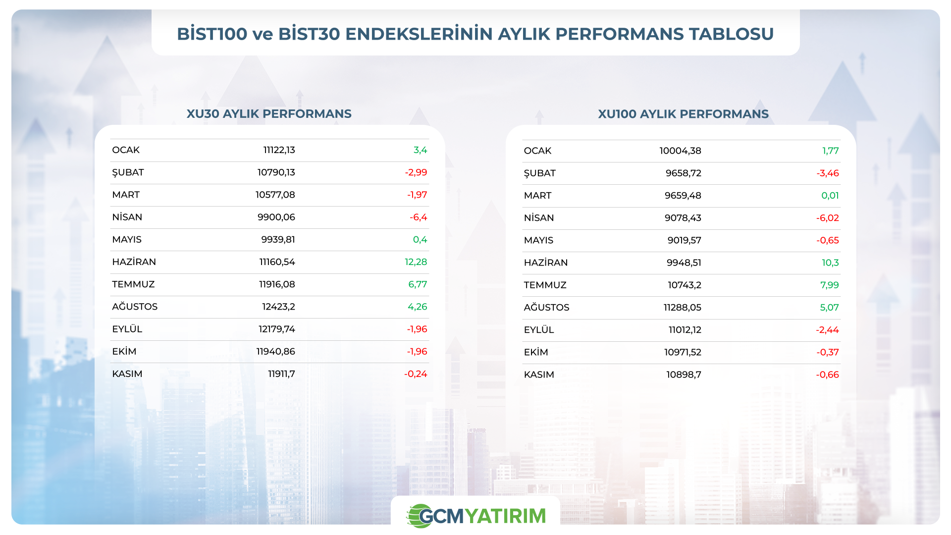 Eylül ve Ekim ayındaki negatif seyrin Kasım ayında da devam ettiği görülmektedir. Haber akışlarının endeksler üzerindeki etkisinin hissedilmeye devam etmesi ve katalist eksiliği piyasadaki karamsarlığı da beraberinde getirmektedir.